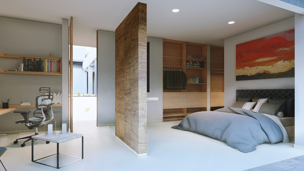La paleta de colores ha sido cuidadosamente seleccionada para resaltar la sobriedad del conjunto. Tonos predominantes como el blanco, beige, piedra natural y pérgolas se combinan para crear un ambiente armonioso y relajante.